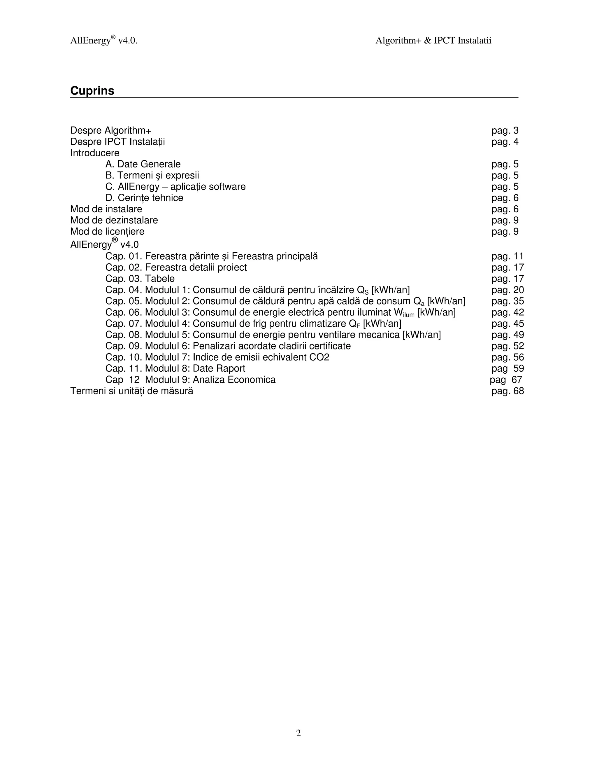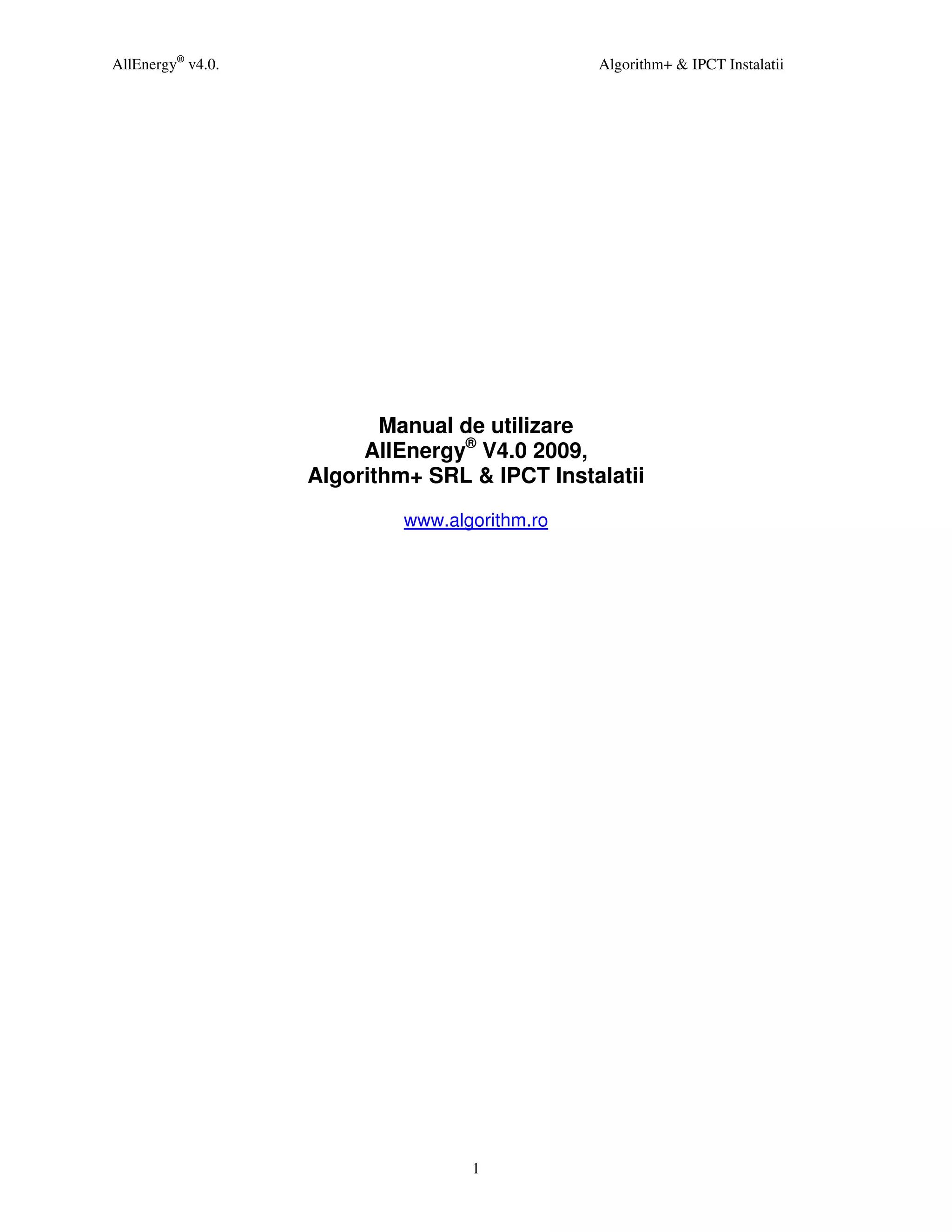 Documentul constituie un manual de utilizare pentru aplicația allenergy® v4.0, dezvoltată de algorithm+ și ipct instalații, care ajută la calculul performanței energetice a clădirilor. Acesta include informații despre cerințele tehnice, modul de instalare și dezinstalare, precum și funcționalitățile aplicației, cum ar fi analiza consumului energetic și emiterea certificatelor de performanță energetică. De asemenea, manualul detaliază contactele companiilor implicate și legislația relevantă în domeniu.