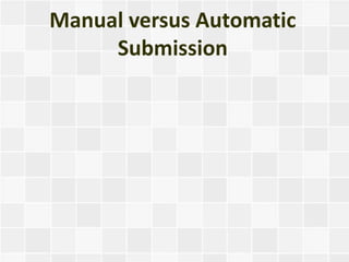 Manual article submission involves individually submitting articles to directories and allows for customizing submissions to each directory's requirements. Automatic submission uses software to submit but directories may treat these as spam and software can't adapt submissions. While manual takes more time, it allows ensuring articles are correctly categorized and follow each directory's policies. When choosing automatic submission, its software and targeting of appropriate categories and directories should be considered.