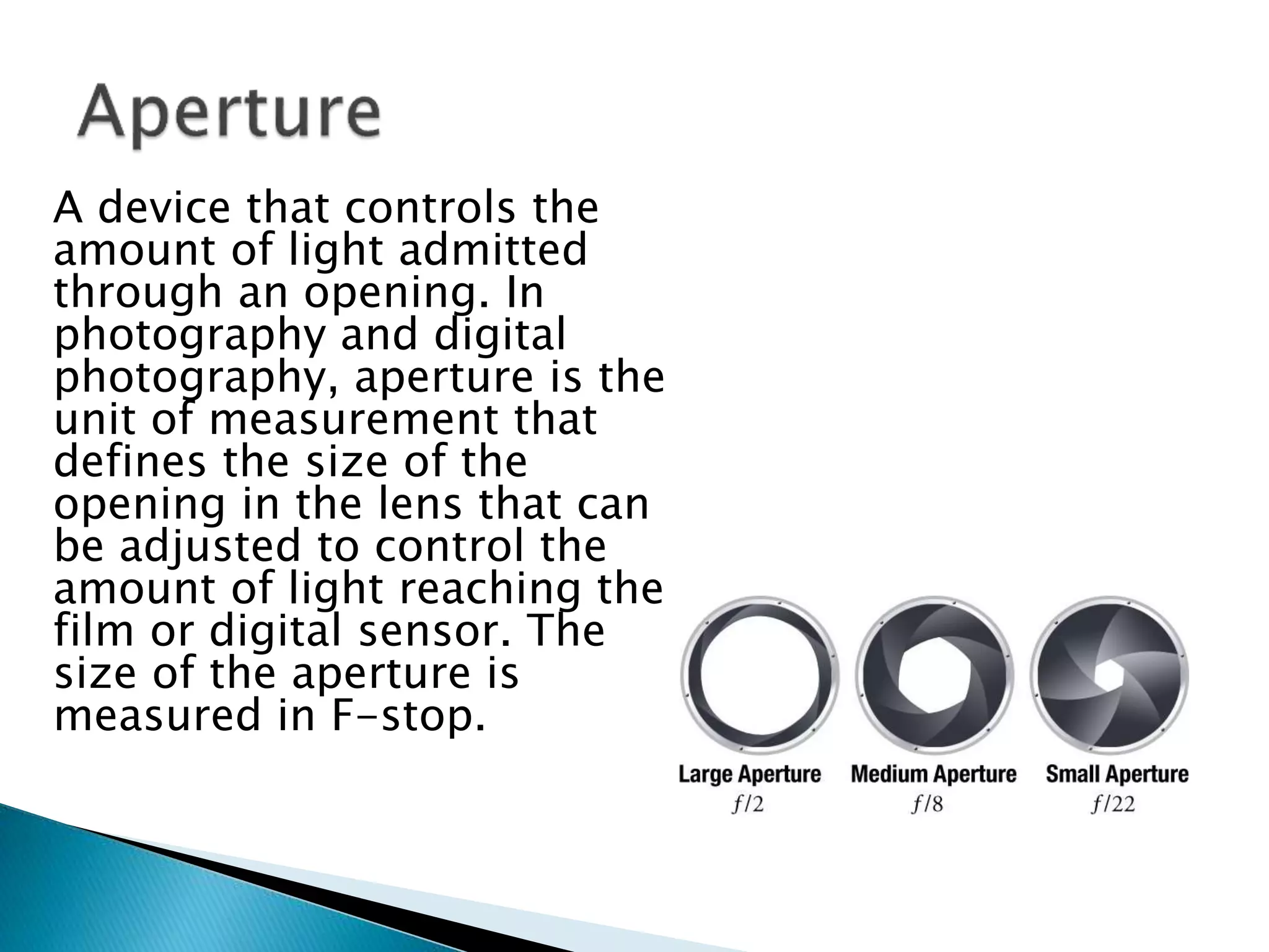 The document discusses aperture, shutter speed, and ISO in photography. It defines aperture as the opening in a camera lens that controls the amount of light reaching the sensor or film. Shutter speed determines how long the shutter remains open when a photo is taken, with slower speeds allowing more light. ISO measures the sensitivity of the image sensor, with higher numbers allowing photos in darker conditions but resulting in grainier images. The document explains how aperture, shutter speed, and ISO work together to control the overall light and exposure of photographs.