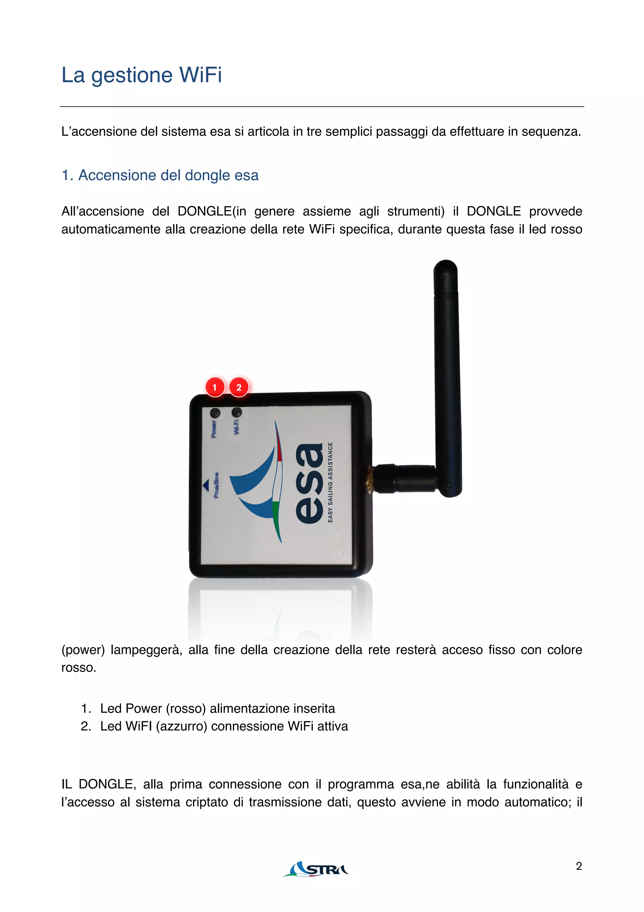 Il documento descrive la gestione del sistema Wi-Fi ESA, includendo dettagli su accensione, connessione ai dispositivi iOS e problemi di connessione. Viene spiegato come configurare correttamente la rete Wi-Fi e gestire eventuali problematiche di ricezione dei dati, con suggerimenti per stabilità e posizionamento dell'antenna. È importante seguire le procedure indicate per garantire il corretto funzionamento del sistema e prevenire interferenze.