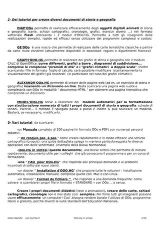 Il documento presenta ooo.hg, un modulo complementare gratuito per la creazione di documenti e attività di storia e geografia, compatibile con vari sistemi operativi. Include una galleria di 1500 carte vettoriali e bitmap, strumenti di disegno e tutorial per facilitare l'insegnamento. Gli utenti possono progettare facilmente e liberamente materiali didattici, esportandoli in diversi formati.