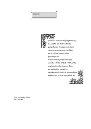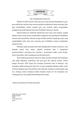 Manual ini memberikan panduan latihan hoki yang komprehensif untuk guru dan pelatih, terutama untuk mereka yang kurang berpengalaman. Manual ini menjelaskan teknik dasar hoki seperti mengelecek, pukulan, menangkap, dan mendorong, serta aktivitas pemanasan, pemulihan, dan permainan kecil. Tujuannya adalah untuk melatih siswa dalam keterampilan hoki dan nilai-nilai sukan yang positif.
