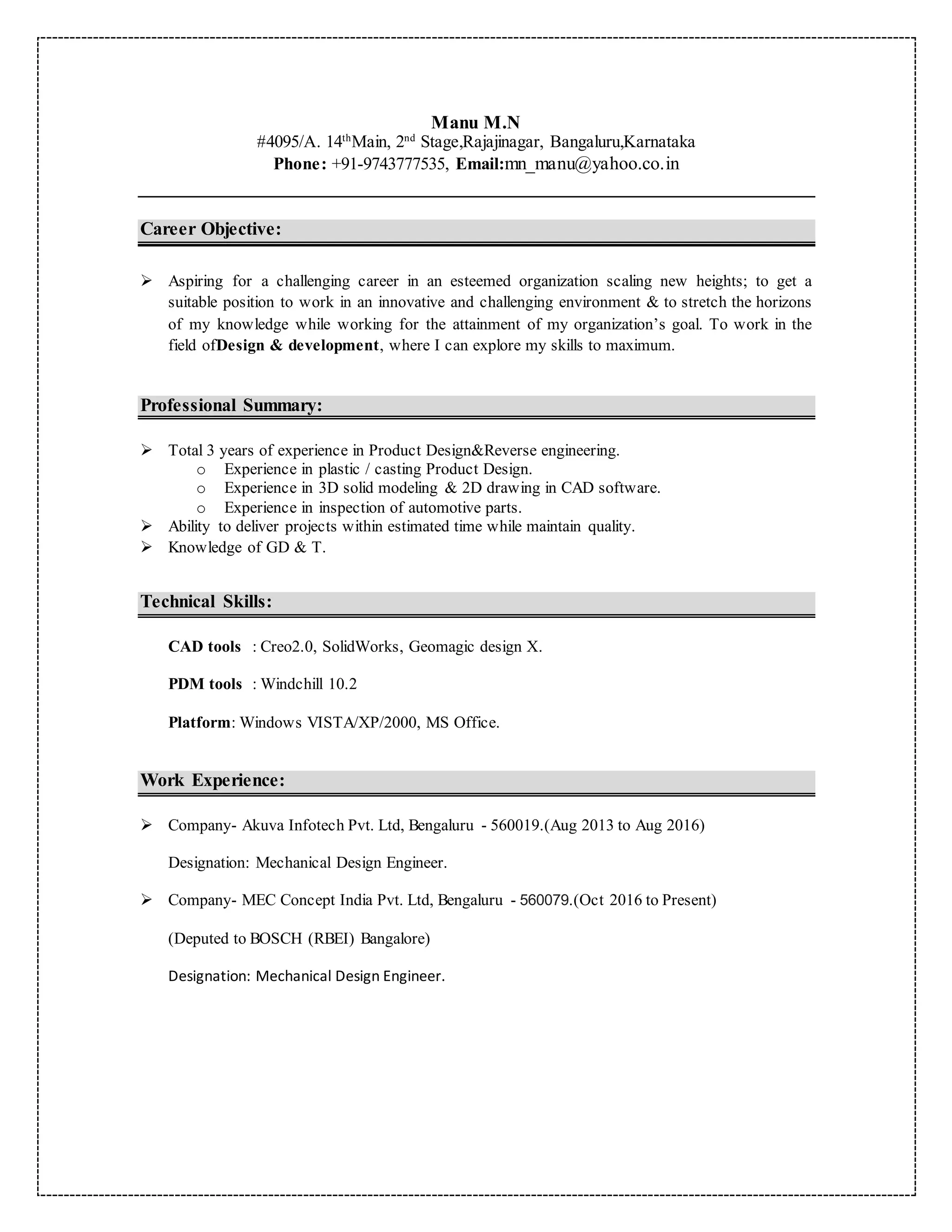 This document contains Manu M.N's resume. It summarizes his career objective, professional experience, technical skills, work experience, projects handled and academic qualifications. Manu has over 3 years of experience in product design and reverse engineering. He is proficient in CAD tools like Creo, SolidWorks and Geomagic Design X. Some of the projects he has worked on include designing a manual assembly workbench for Bosch Rexorth and benchmarking an engine cylinder head for Harita Fehrer. Manu holds a B.E in Mechanical Engineering and is currently working as a Mechanical Design Engineer at MEC Concept India Pvt. Ltd.