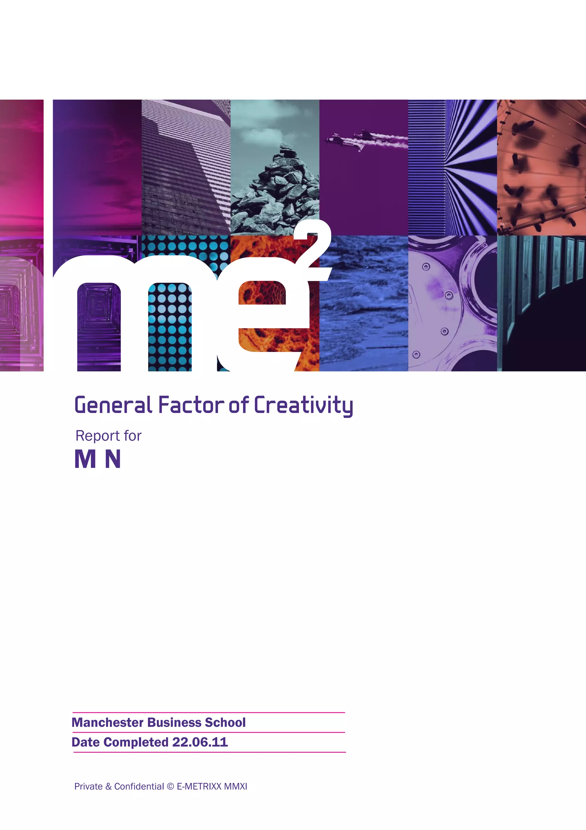 This document provides an overview of creativity and innovation as measured by the General Factor of Creativity assessment. It describes creativity as the ability to develop new ideas and solutions, and innovation as applying creativity to create new products or processes. The assessment measures 12 individual factors relating to idea generation, personality, motivation, and confidence, which are combined to derive an overall General Factor of Creativity score. The document explains that the score indicates the extent to which someone views themselves as creative and innovative.