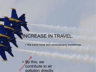 Technology has contributed to increased environmental pollution and waste in three key ways: 1) It has led to more travel, both necessary and unnecessary, which directly contributes to air pollution from emissions. People now travel more globally compared to historically relying on animals for transportation. 2) Technology requires significant power consumption which pollutes the environment due to our addiction to devices like TVs, smartphones and gadgets that need to be powered constantly. 3) Rapid technological upgrades generate a large amount of toxic electronic waste, while also causing deforestation as forests are cleared to make way for development projects.