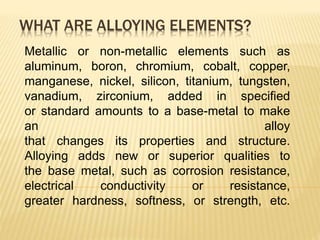 Metallic or non-metallic elements are added to base metals in specified amounts to make alloys with new properties. This process is called alloying. Alloying elements include aluminum, boron, chromium, cobalt, copper, manganese, nickel, silicon, titanium, tungsten, vanadium, and zirconium. Alloys have superior qualities like corrosion resistance, electrical conductivity, hardness, or strength compared to base metals. Common alloys used in daily life include those used in kitchen utensils, vehicles, computers, phones, and medical and engineering equipment. Steel is an important alloy of iron and carbon, and different amounts of carbon or additional alloying elements give steel properties suitable for different applications.