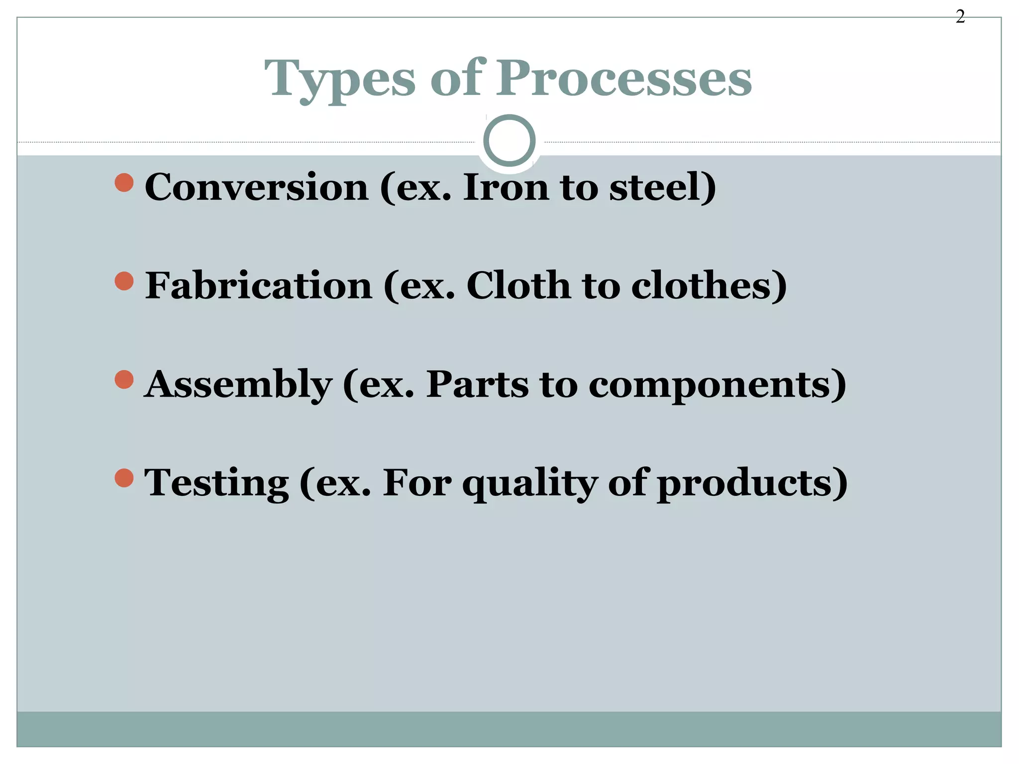 This document discusses manufacturing processes and process selection. It describes four main types of processes: conversion, fabrication, assembly, and testing. It then explains four common process flow structures used in manufacturing: job shop, batch shop, assembly line, and continuous flow. It provides examples of each structure. The document goes on to describe break-even analysis, a method to determine the production volume needed for a process to break even financially. It provides an example calculation. Finally, it defines manufacturing process flow design and lists common tools used, including assembly drawings, charts, and operation sheets, providing an example assembly chart.