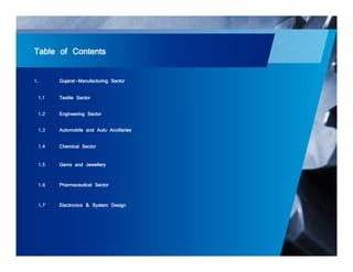 The document outlines the manufacturing sector in Gujarat, highlighting its contribution of 28.21% to the state's GDP and its leadership in producing textiles, chemicals, and pharmaceuticals. The government has identified key sectors for growth, including textiles, engineering, and auto components, with policies aimed at increasing manufacturing’s share of the economy. Gujarat's manufacturing industry has shown significant growth, with plans to enhance its capabilities and infrastructure over the coming years.