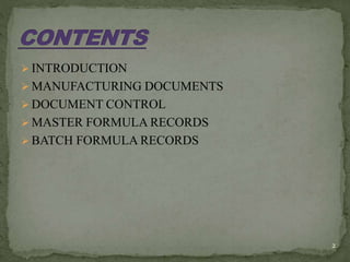 This document provides an overview of pharmaceutical documentation and quality control processes. It discusses the importance of documentation in areas like manufacturing, batch records, and quality control. The key points covered are: