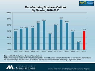 The Manufacturing Economic Update provides insights into trends and projections for the U.S. manufacturing sector through 2013, highlighting anticipated growth in sales, investment, and employment despite ongoing challenges such as rising costs and financing issues. It notes improvements in areas like housing, consumer spending, and global competitiveness largely attributed to the shale gas revolution. The report emphasizes the necessity for a comprehensive plan to enhance the U.S. manufacturing environment to ensure economic growth and attract foreign investment.
