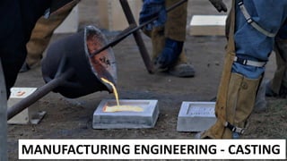 The document provides a comprehensive overview of manufacturing engineering, specifically focusing on casting processes, including types of patterns and molds, materials used, and their properties. Key topics include the steps in casting, advantages and disadvantages of various casting methods, and the defining characteristics of gating systems. Additionally, it covers techniques for ensuring proper mold creation and the importance of pattern allowances in successful casting outcomes.
