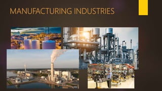 This document provides information about manufacturing industries in India. It discusses key topics like the importance of manufacturing industries for economic development, various types of manufacturing industries including cotton, jute, sugar, iron and steel, aluminum, chemicals, fertilizers, cement, automobile and electronics. It also covers industrial location factors, classification of industries, challenges faced by different industries, and environmental pollution caused by industries.