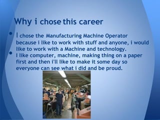 Ryan is interested in becoming a manufacturing machine operator. They would like to work with machines and technology to make things. As a machine operator, they would work on machines each day to help people and earn around $48,236 per year. The job requires some on-the-job training but becoming highly skilled takes about a year. Employment in this field is expected to grow faster than average through 2020 due to infrastructure spending. Operators use technology to build and repair machines while collaborating with employers. Ryan finds this career appealing because they enjoy making things for others.