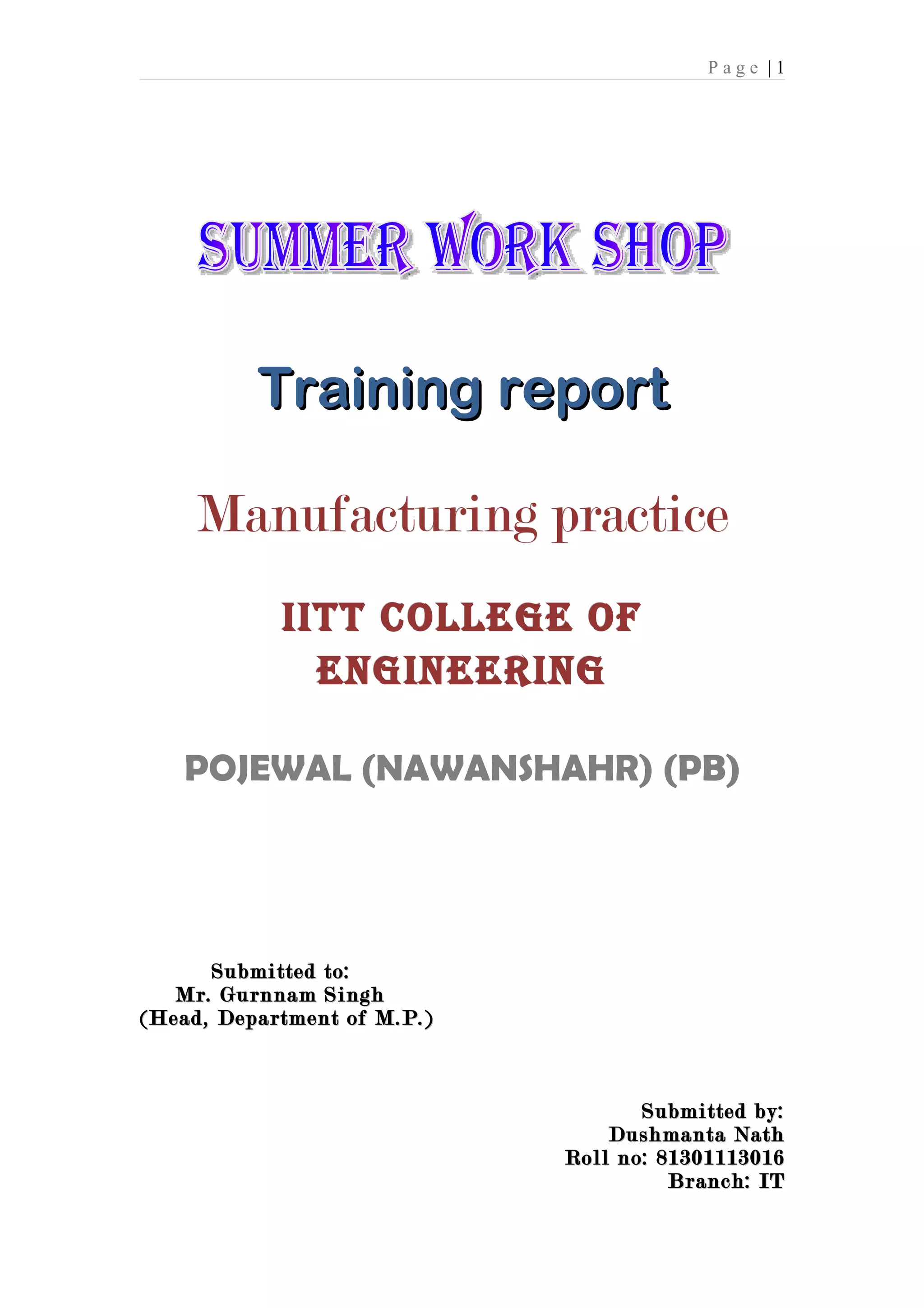 The document discusses training in manufacturing practices and welding. It provides details on operations performed in carpentry, fitting, and welding shops. These include cutting, dimensioning, planning, grooving, finishing, and welding pieces of wood, iron, and steel. Precautions for safe tool use are also outlined. The document categorizes and describes various tools used in each shop, such as saws, chisels, planes, files, hammers, drills, and welding equipment.