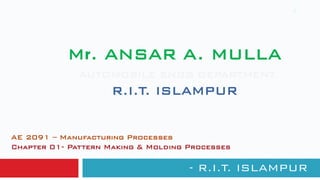 This document provides an overview of pattern making and molding processes in manufacturing. It begins with an introduction to manufacturing processes and casting. Key points include that casting allows for complicated shapes to be made in a single piece and reduces assembly work. The document then discusses pattern materials like wood, metal, and plastic and different types of patterns like solid, split, and multi-piece patterns. It also covers allowances given to patterns for shrinkage, draft, and machining. The final sections cover gates, runners, risers, and core making including different core types.