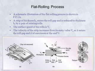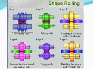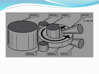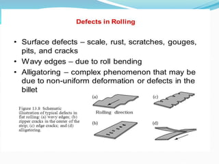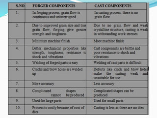 Metal forming processes involve hot working and cold working of metals. Hot working involves mechanically working metals above their recrystallization temperature through processes like forging, rolling, extrusion, drawing, and spinning. Forging is done using open die forging or closed die forging. Common forging operations include upsetting, drawing down, blocking, fullering, and cutting. Cold working is done below the recrystallization temperature through processes like drawing, squeezing, and bending. Defects in forged metal parts can include cracking, laps, cold shuts, warping, and improperly formed sections.