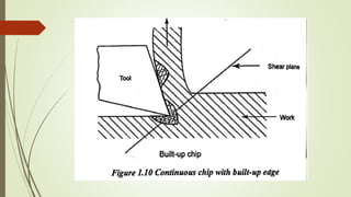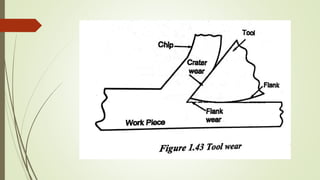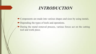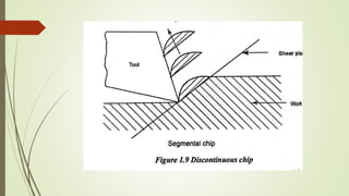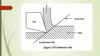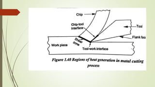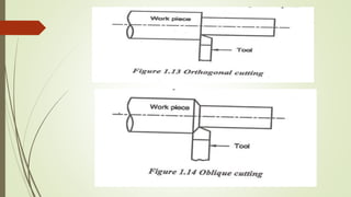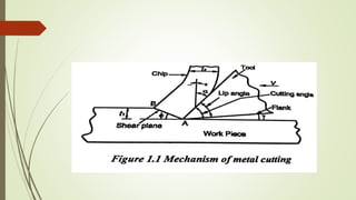 The document provides an overview of the theory of metal cutting. It discusses the mechanics of chip formation, types of chips, cutting tools and their components/angles. It also describes the metal cutting process, orthogonal vs oblique cutting, thermal aspects of cutting, tool wear and life, factors affecting surface finish and machinability. Cutting fluids, their functions and types are also summarized.