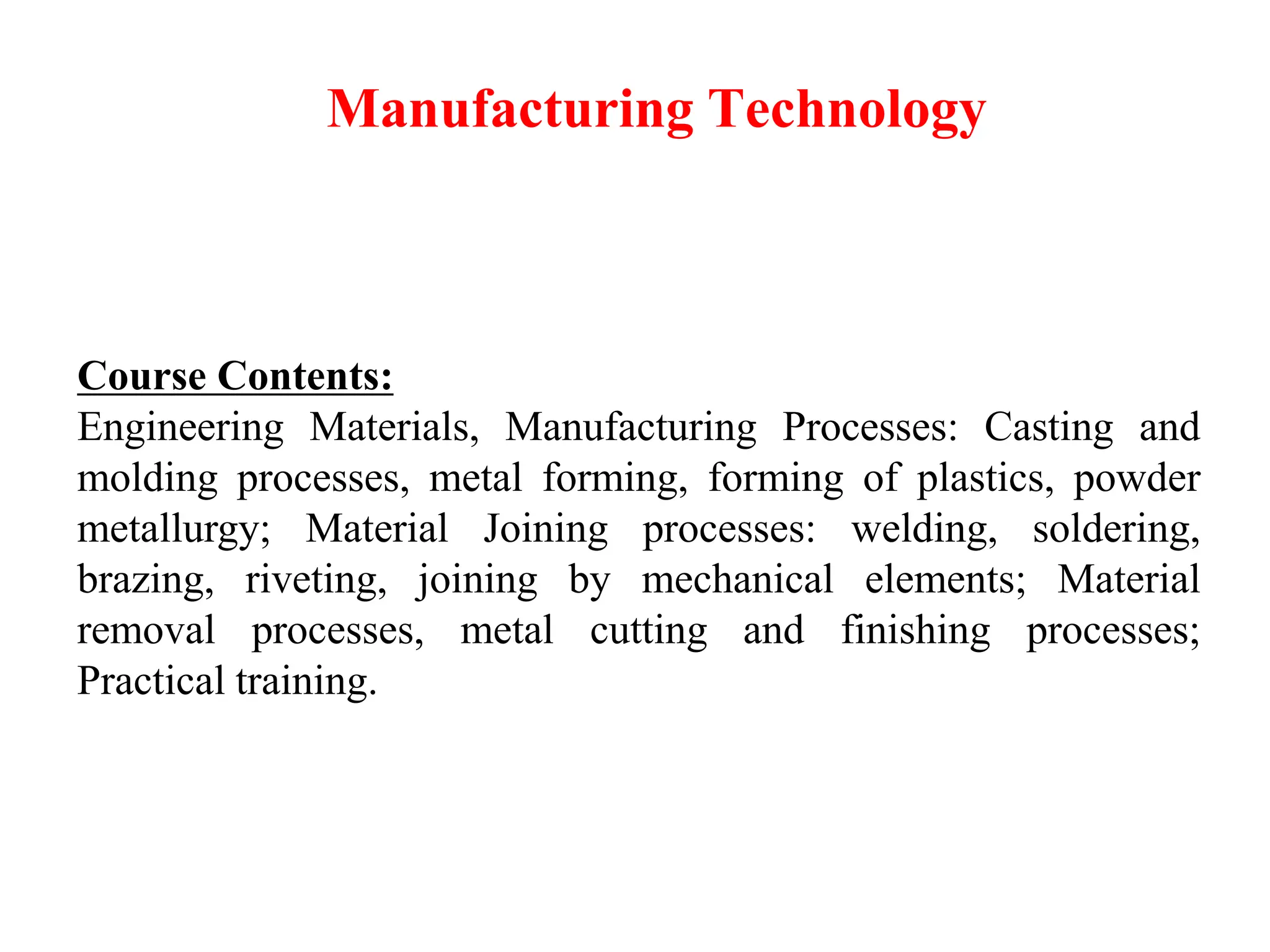 The document outlines a manufacturing technology course that covers engineering materials, manufacturing processes, and practical training in techniques such as casting, welding, and machining. It emphasizes the importance of understanding different materials, including metals, ceramics, polymers, and composites, and their respective properties for effective manufacturing. By the end of the course, students will acquire the necessary skills to analyze and optimize manufacturing operations, making informed decisions on materials and quality control.