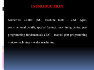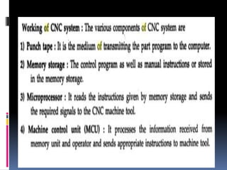 This document provides information about CNC (Computer Numerical Control) machines. It discusses: