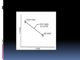 - Types of motion control systems like point-to-point positioning and continuous path/contouring. Interpolation methods including linear and circular are described.