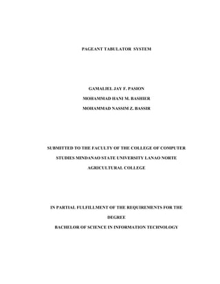 This document discusses the development of a Pageant Tabulator System mobile application by students at Mindanao State University Lanao Norte Agricultural College. It will be used to tabulate results for various school pageants and events. Chapter 1 introduces the problems with current manual tabulation methods and the objectives of creating a mobile app to accurately and efficiently calculate scores and results. Chapter 2 provides a literature review of several existing event tabulation systems and their features. The document outlines the research methodology that will be used to analyze requirements, design, implement, test and deploy the new Pageant Tabulator System.