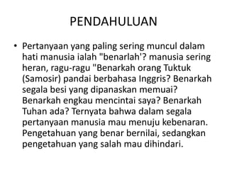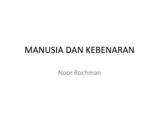 Dokumen tersebut membahas tentang manusia dan kebenaran. Terdapat beberapa poin penting yaitu bahwa kebenaran bersifat dinamis, paradoksal, dan multidimensional dimana kebenaran relatif namun juga mutlak. Dokumen juga membahas berbagai metode untuk mendapatkan pengetahuan kebenaran seperti metode bayani, irfani, dan burhani.