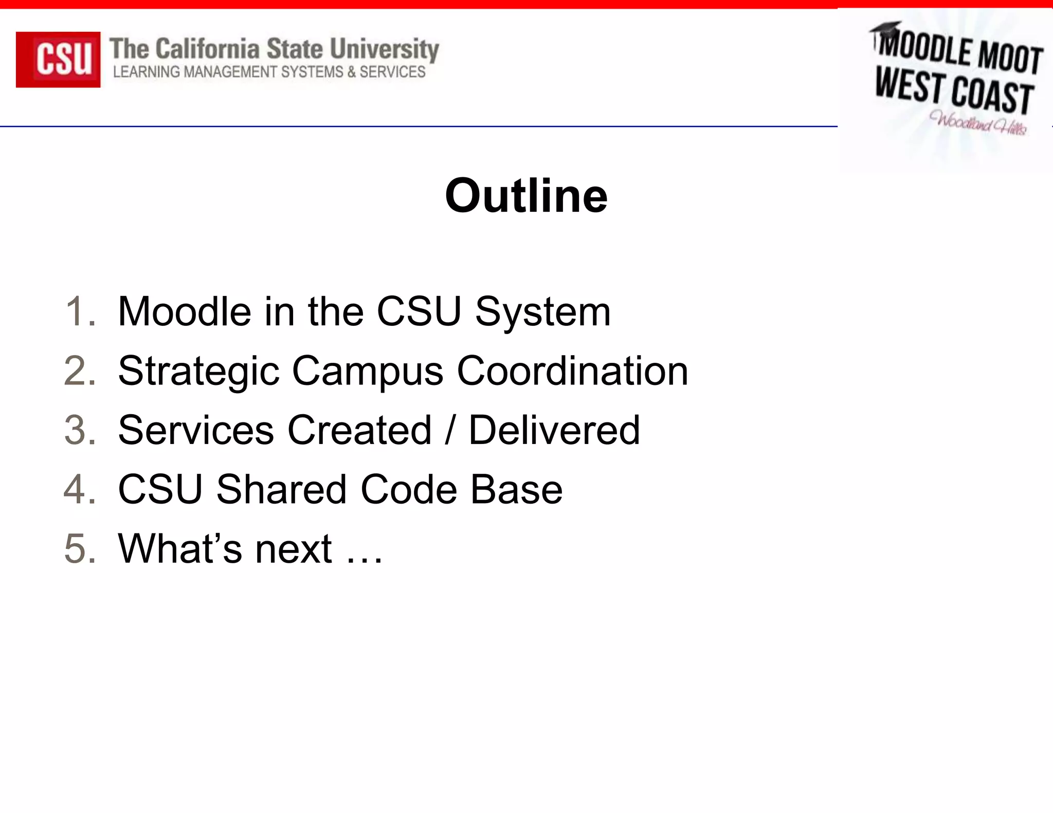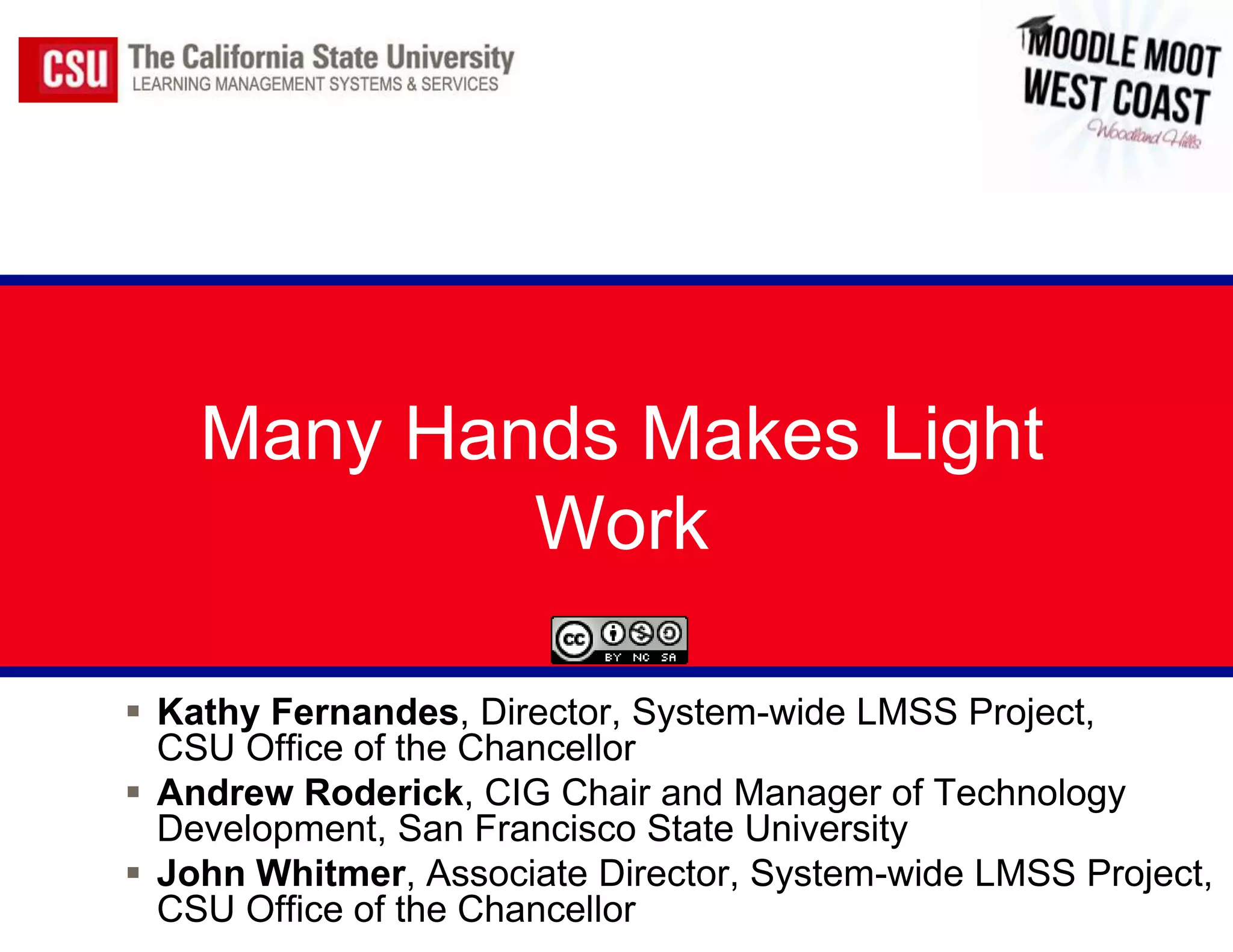 The document outlines the California State University's (CSU) implementation and governance of Moodle as their learning management system (LMS) across 23 campuses, detailing the strategic goals, challenges, and collaboration efforts initiated since 1997. It highlights significant budget constraints faced by CSU, the collaborative approach taken for LMS adoption, and the establishment of a shared code base to promote efficiency. The document concludes with future objectives, including migration to Moodle 2.x and enhancing campus-to-campus collaboration.