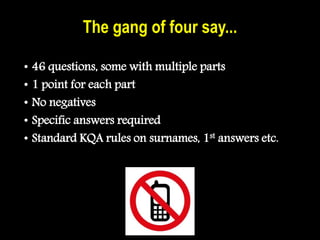The document is a quiz featuring 46 questions with multiple parts, covering a wide range of historical and political topics, including Marxism, significant political figures, and major historical events. Each question requires specific answers and adheres to standard quiz rules. Notable themes include the influence of various political movements and figures throughout history.
