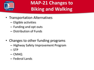 MAP-21 consolidated several transportation programs including Transportation Enhancements, Safe Routes to School, and Recreational Trails into the new Transportation Alternatives program. It reduced funding for biking and walking projects and made changes to project eligibility and how funding is distributed between population-based and competitive grant programs. It also expanded eligibility and opportunities for biking and walking projects to receive funding under programs like HSIP, CMAQ, STP, and Federal Lands transportation.