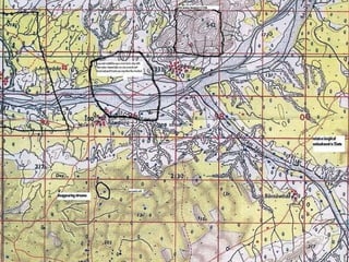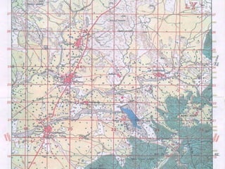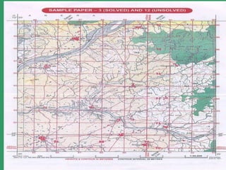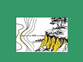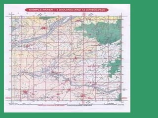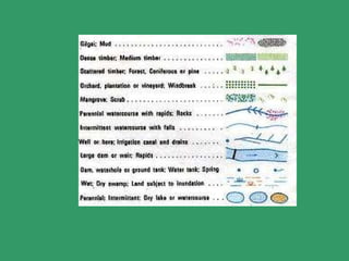A topographical map shows both natural and man-made features using contour lines and colors to represent elevation, terrain, and land use. Contour lines connect points of equal height and indicate the steepness of slopes. Common topographical map symbols and features include contour intervals, spot heights, settlements, drainage patterns, vegetation, infrastructure like roads and railroads, and land use patterns related to occupations. Topographical maps are scaled and use a grid system of eastings and northings to precisely locate points.