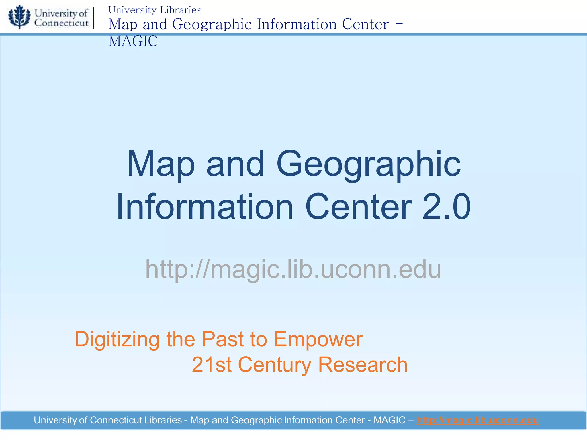 The University of Connecticut Libraries' Map and Geographic Information Center (MAGIC) is focused on providing access to Connecticut-focused geographic information and data for both residents and global researchers. MAGIC 2.0 offers tools for browsing and displaying geospatial data, creating customized maps, and using web mapping services (WMS), enhancing the accessibility and usability of geographic information. The center encourages collaboration on grants and projects to increase public access to spatial data and maps in Connecticut.