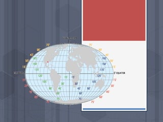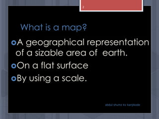 A map is a graphical representation of an area using symbols and a scale. The document outlines the key parts of a map including the legend, cardinal directions, scale, and landforms/water features. It also describes different types of maps like political, physical, and thematic maps. Finally, it discusses important map elements such as latitude and longitude lines, grids, and landforms.
