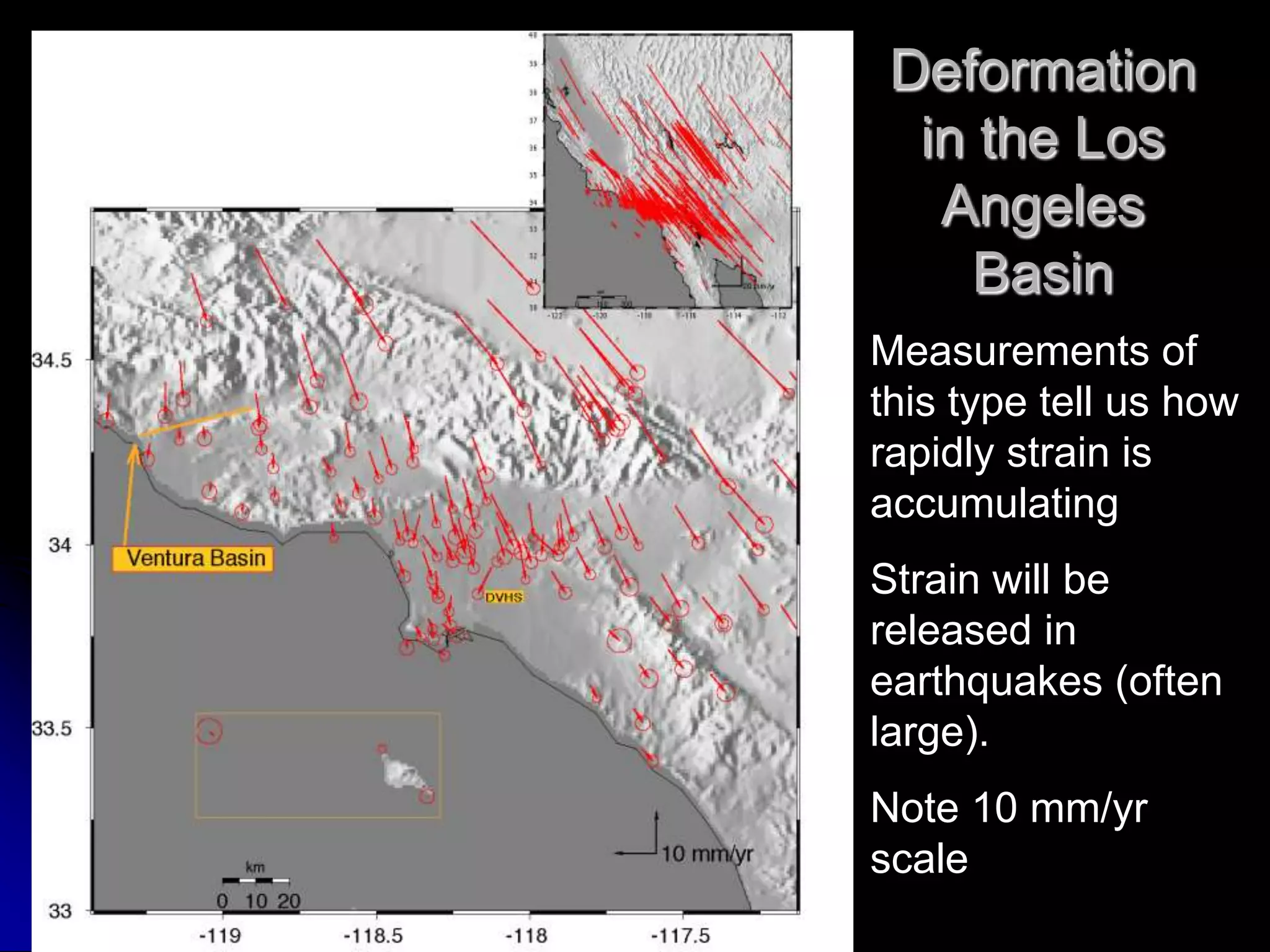 Deformation in theLos Angeles BasinMeasurements of this type tell us how rapidly strain is accumulatingStrain will be released in earthquakes (often large).Note 10 mm/yr scale