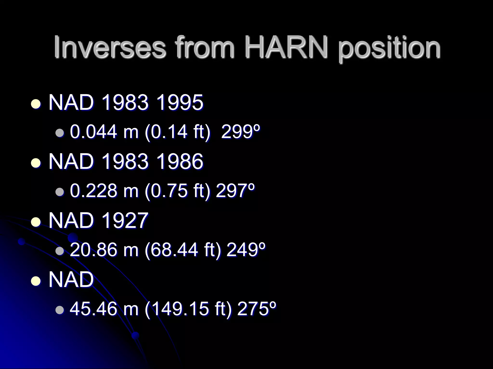 Inverses from HARNpositionNAD 1983 19950.044 m (0.14 ft) 299ºNAD 1983 19860.228 m (0.75 ft) 297ºNAD 192720.86 m (68.44 ft) 249ºNAD45.46 m (149.15 ft) 275º