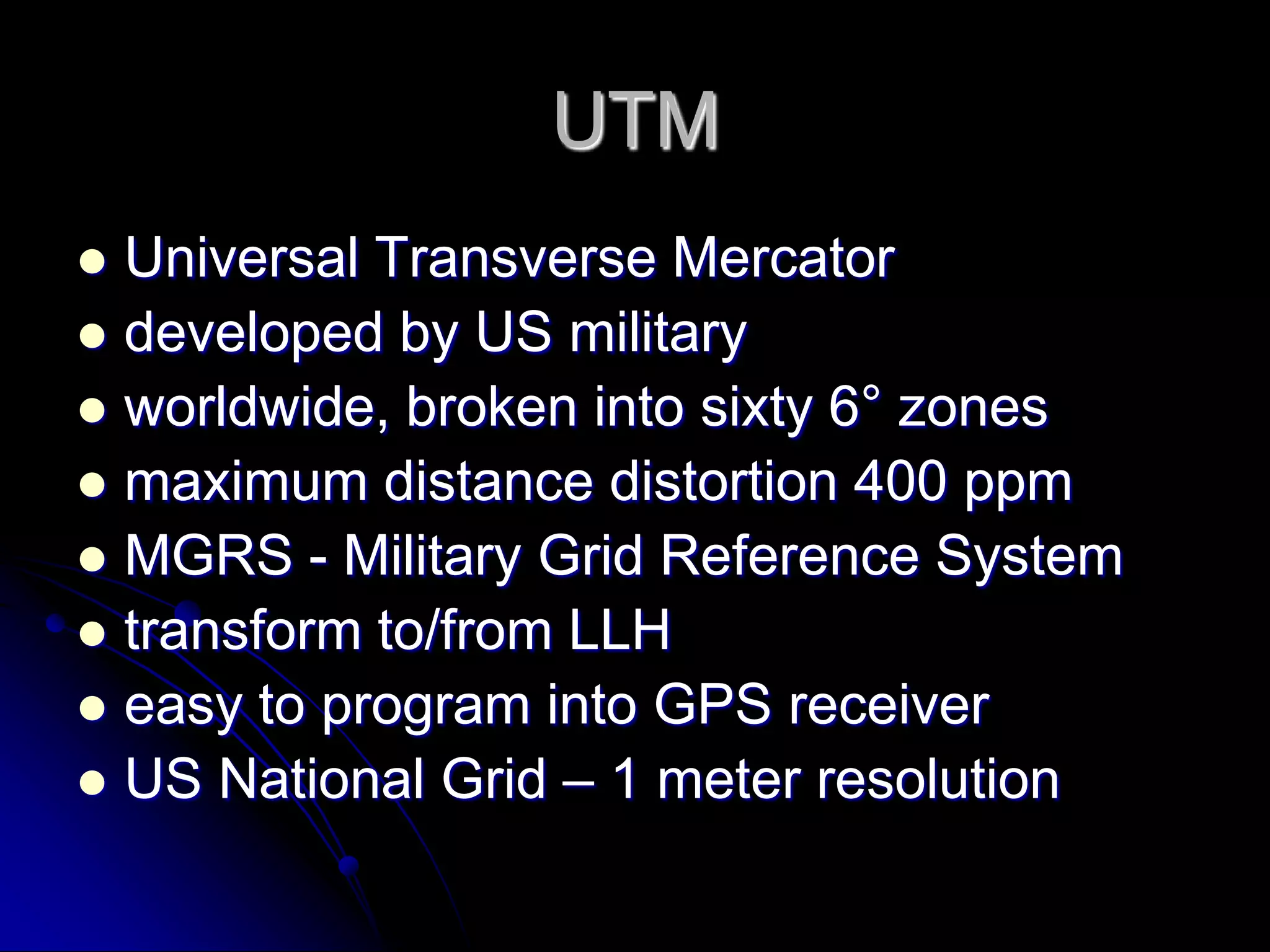 UTMUniversal Transverse Mercatordevelopedby US militaryworldwide, broken into sixty 6° zonesmaximum distance distortion 400 ppmMGRS - Military Grid Reference Systemtransform to/from LLHeasy to program into GPS receiverUS National Grid – 1 meter resolution