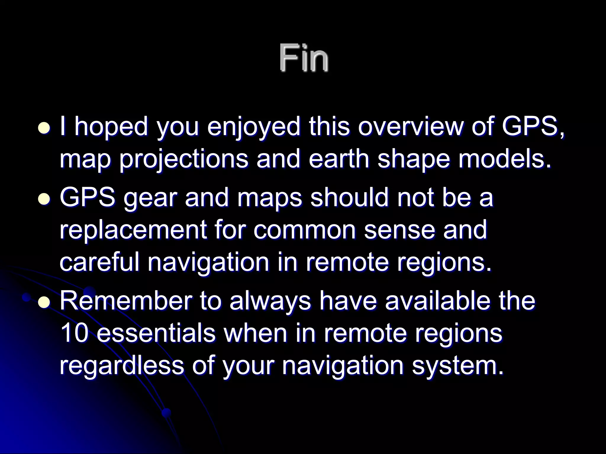 FinI hoped youenjoyed this overview of GPS, map projections and earth shape models. GPS gear and maps should not be a replacement for common sense and careful navigation in remote regions.Remember to always have available the 10 essentials when in remote regions regardless of your navigation system.