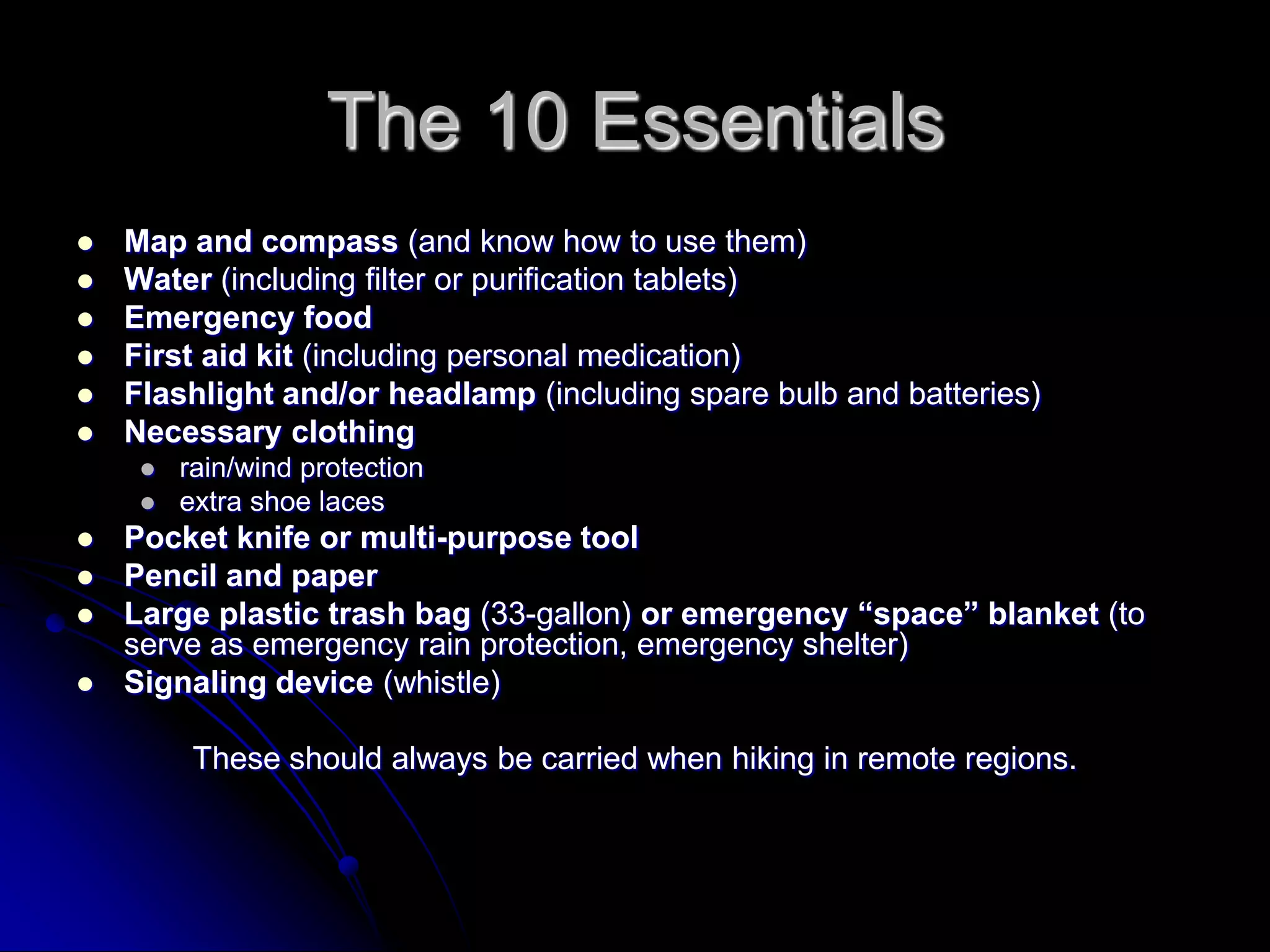 The 10 EssentialsMapand compass (and know how to use them) Water (including filter or purification tablets) Emergency foodFirst aid kit (including personal medication) Flashlight and/or headlamp (including spare bulb and batteries) Necessary clothingrain/wind protection extra shoe laces Pocket knife or multi-purpose toolPencil and paperLarge plastic trash bag (33-gallon) or emergency “space” blanket (to serve as emergency rain protection, emergency shelter) Signaling device (whistle) These should always be carried when hiking in remote regions.
