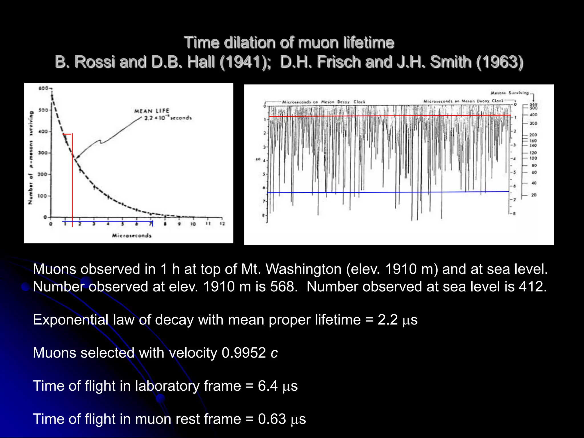 Time dilation ofmuon lifetimeB. Rossi and D.B. Hall (1941); D.H. Frisch and J.H. Smith (1963)Muons observed in 1 h at top of Mt. Washington (elev. 1910 m) and at sea level.Number observed at elev. 1910 m is 568. Number observed at sea level is 412.Exponential law of decay with mean proper lifetime = 2.2 sMuons selected with velocity 0.9952 cTime of flight in laboratory frame = 6.4 sTime of flight in muon rest frame = 0.63 s