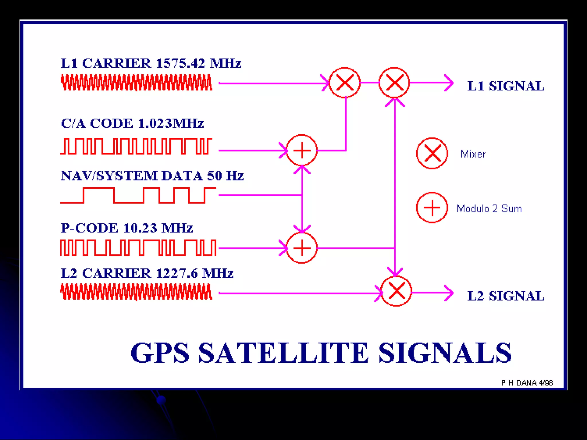 SVs transmit twomicrowave carrier (carry information) signalsL1 (1575.42 MHz): carries navigation message; SPS code (SPS: standard positioning servic)L2 (1227.60 MHz): measures ionospheric delay3 binary codes shift L1 and/or L2 carrier phasesC/A code (coarse acquisition) modulates L1 carrier phase …repeating 1 MHz pseudo random noise (PRN) code …pseudo-random because repeats every 1023 bits or every millisecond…each SV has its own C/A code …basis for civilian SPSP-code (precise) modulates both L1 and L2 …long (7 days) pseudo random 10 MHz noise code …basis for PPS (precise positioning service) …AS (anti-spoofing) encrypts P-code into Y-code (need classified module for receiver)navigation message modulates L1-C/A; 50 Mhz signal ….describes satellite orbits, clock corrections, etc.