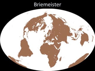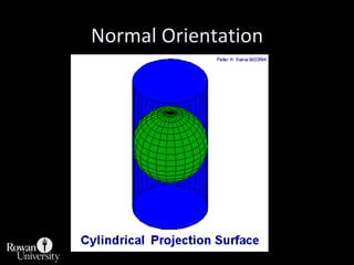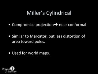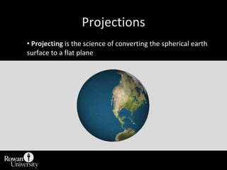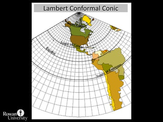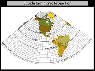 This document discusses different types of map projections used to represent the spherical earth on a flat surface. It describes how all projections involve some distortion of properties like shapes, areas, distances or directions. The key types are conformal, equivalent, and equidistant projections. It explains the concepts of projection surfaces like cones, cylinders and planes, as well as variables like the light source and orientation. Specific common projections are also outlined, such as Mercator, Lambert conformal conic, and azimuthal equidistant, along with their characteristic distortions and uses.