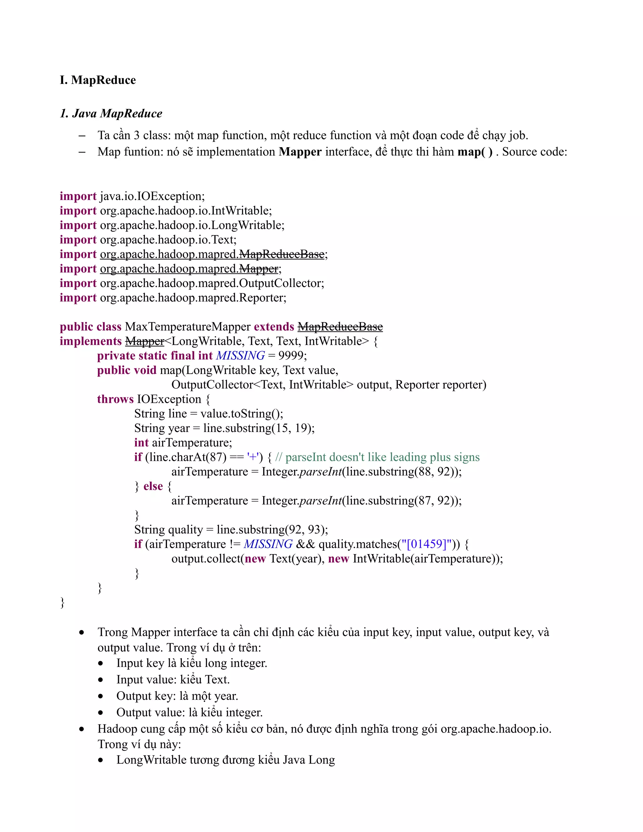 Tài liệu mô tả quá trình và cấu trúc của MapReduce và HDFS trong hệ sinh thái Hadoop, bao gồm các lớp và chức năng cần thiết để triển khai chương trình xử lý dữ liệu lớn. Nó cũng giải thích cách thức hoạt động của các tác vụ Map và Reduce, cách cấu hình và thực thi công việc, và các khái niệm cơ bản về hệ thống tệp phân tán HDFS. Cuối cùng, tài liệu đề cập đến vấn đề lưu trữ và cân bằng dữ liệu trong HDFS, cùng với các công cụ quản lý và duy trì hiệu suất hệ thống.