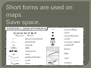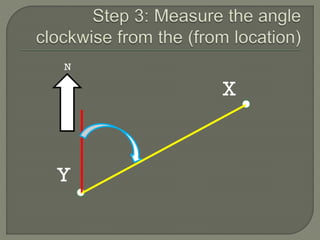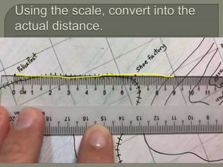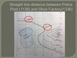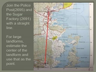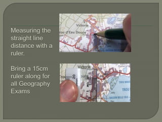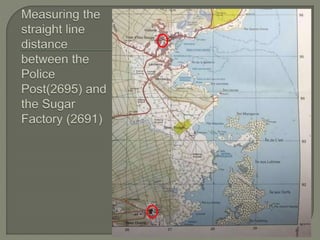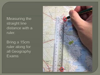 This document provides information about key concepts in geography related to interpreting topographical maps, including grid references, bearings, scale and distance, keys and legends. It explains how to determine 4-digit and 6-digit grid references to identify specific locations on a map. It also describes how to measure bearings and convert distances on a map to real-world distances using map scales. The document emphasizes the importance of understanding symbols and legends in interpreting different features on a topographical map.
