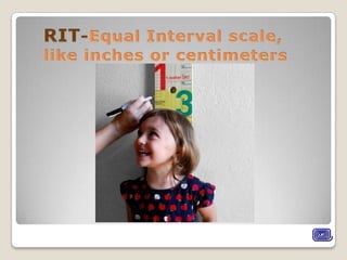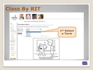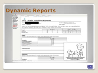 The document appears to be a report on a student's academic progress, strengths, and areas for improvement based on various assessments. It includes the student's RIT score ranges from spring 2011 testing in reading goals, word analysis, comprehension levels, and literature response. The report allows teachers to view dynamic data on the student's performance and select specific subjects for more detailed information.