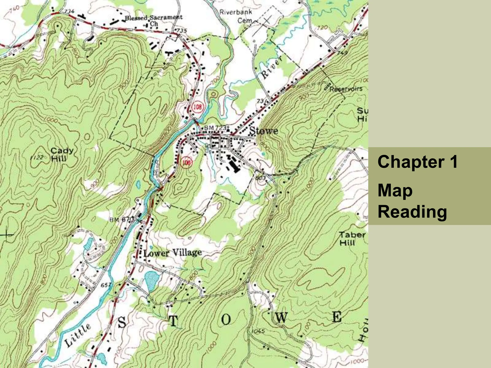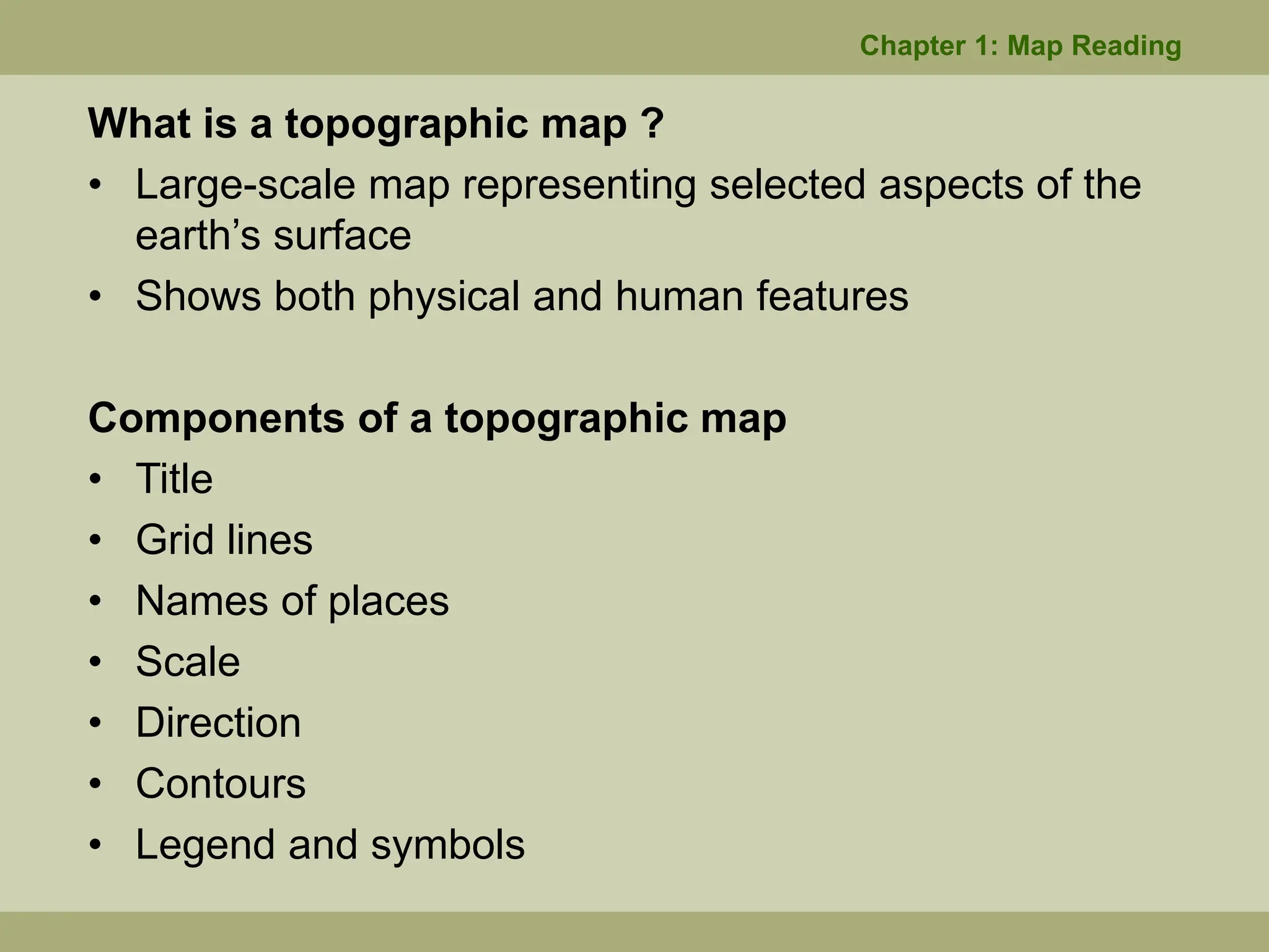 Chapter 1 covers the fundamentals of topographic map reading, detailing its key components such as grid lines, scales, and the representation of physical and human features. It explains how to determine grid references with examples, the methods for measuring straight and curved distances, and describes directions using compass points and bearings. Additionally, it highlights contour lines for elevation, river features, drainage patterns, and calculating gradients, ultimately presenting techniques for interpreting and creating cross-sections of relief features.