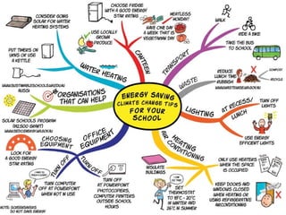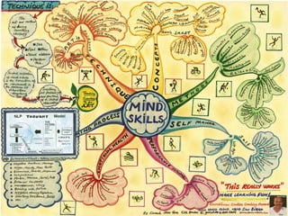 - The document discusses mind mapping, including its history, benefits, and applications. Mind mapping involves creating diagrams to represent ideas using techniques like colored branches, keywords, and personal style.