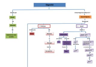 Serveix per s’encarrega de realitzar-la l’Digestió<br />Aparell digestiuDividir<br /> Els format per<br /> 2 Estómac 1 Intestí Aliments <br /> En té forma de els dividit en<br />Borsa Aliments Intestí primIntestí gros Substàncies més senzilles <br /> <br /> es que mesura per on les es un on les <br />BarregenSubstàncies aprofitablesSubstàncies no aprofitables Tub7 m <br /> Que mesura<br />Excrements Amb els Passen a la es transformen en <br />Sucs gàstrics 1,5mSang<br />Expulsen I se <br /> <br /> pel <br />Anus <br />4 Boca 3 Esòfag on les es un a través d’ell els <br />DentsAliments Tub <br />Trituren <br /> que mesura arriben a l’ <br />25cmEstómac <br /> els <br />Aliments<br /> i se <br />Barregen<br /> amb la <br />Saliva<br />Ahmed <br />