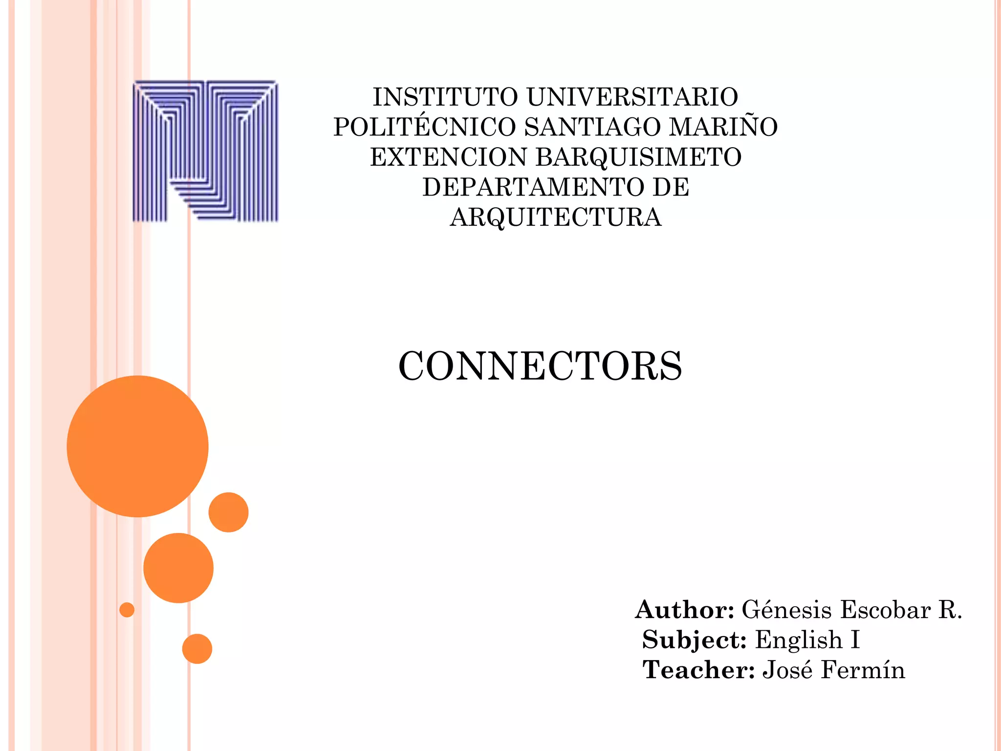 The document is about connectors in English. It discusses different types of connectors used within paragraphs to link ideas, including conjunctions, propositions, and transition words like "therefore", "also", and "however". It notes that "it" is used after verbs like "to be". The summary provides the key topic and purpose of the document in under 3 sentences.