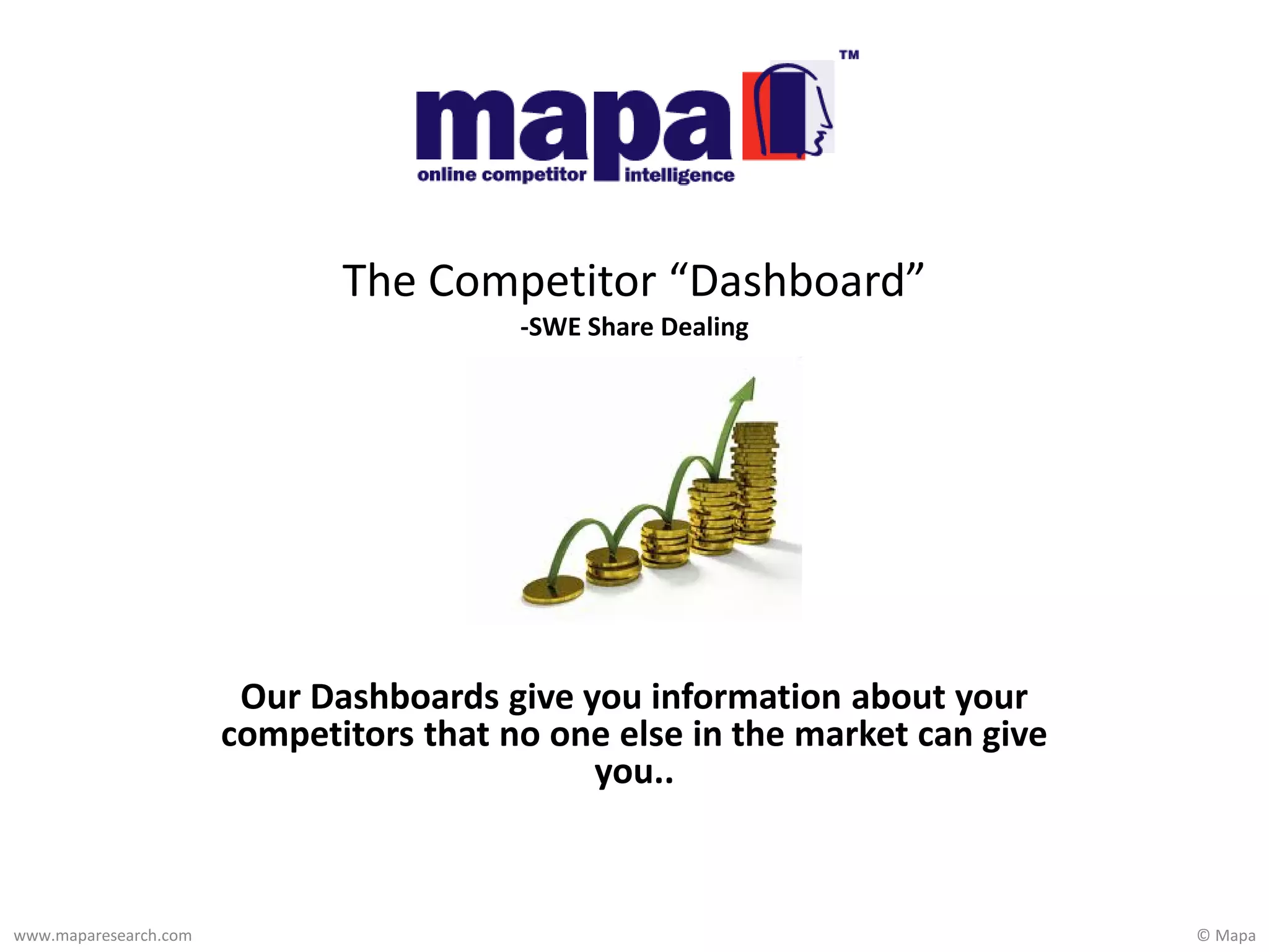 Mapa provides competitor dashboards that give insights into competitors that others cannot. The dashboards monitor competitors continuously, keep clients updated on market changes, and compare features. They help clients identify opportunities, learn from independent analysis, and create influential reports. The dashboards are a relationship, providing timely alerts and access to experts to make clients' jobs easier.