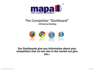 Mapa provides competitor dashboards and consulting services to help clients stay informed about competitors in the banking industry. Their dashboards give timely insights into competitors' websites, applications, marketing strategies, and more. Mapa monitors real accounts at multiple banks to provide an in-depth perspective that cannot be replicated. They aim to be an extension of clients' knowledge through ongoing support and guidance on market trends and competitor activities.