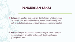 Dokumen ini membahas zakat dalam konteks pembangunan sosial dan ekonomi dalam Islam, menjelaskan definisi, jenis, dan syarat-syaratnya. Zakat merupakan kewajiban bagi umat Islam yang memenuhi kriteria tertentu dan bertujuan untuk membersihkan harta serta membantu masyarakat kurang mampu. Dengan penyaluran zakat yang tepat, dapat tercipta kesejahteraan sosial dan peningkatan ekonomi.